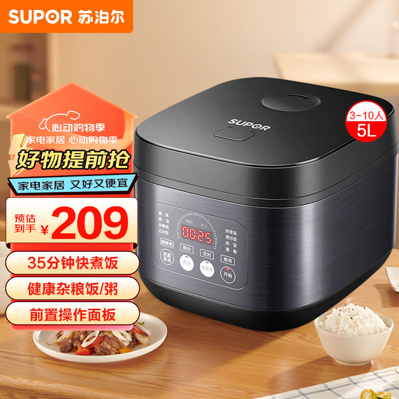 苏泊尔(SUPOR)电饭煲电饭锅5L健康不粘内胆3-10人前置大屏面板杂粮养生饭多功能家用智能电饭煲50FC996价格:209.00元!