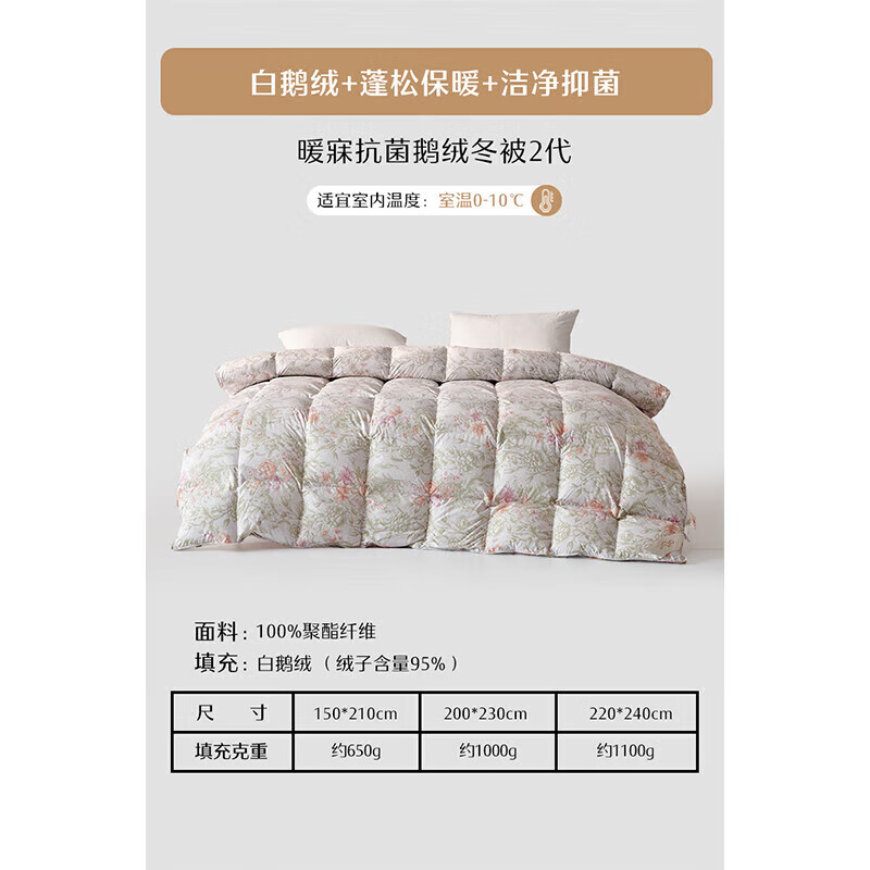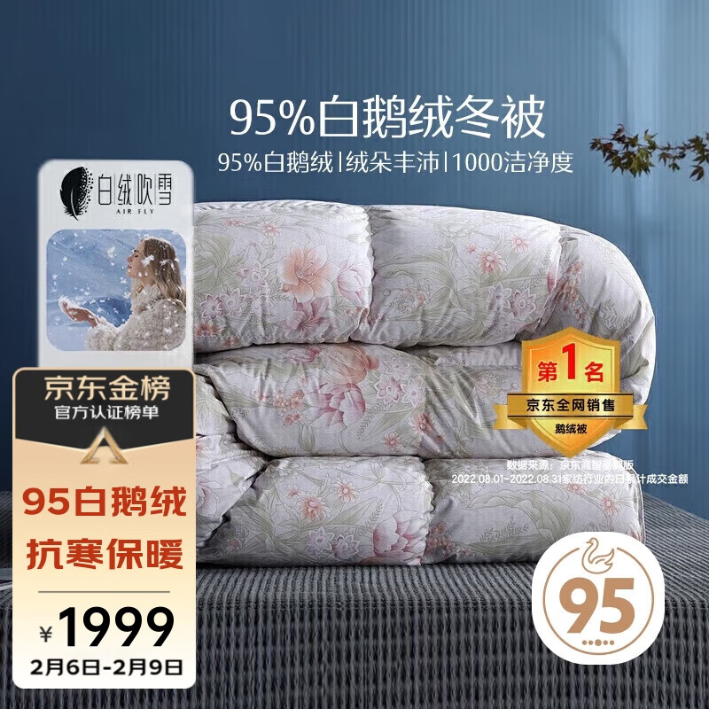 水星家纺白绒吹雪抗菌95%白鹅绒羽绒被冬被(1100g填充)220*240cm价格:2399.00元!