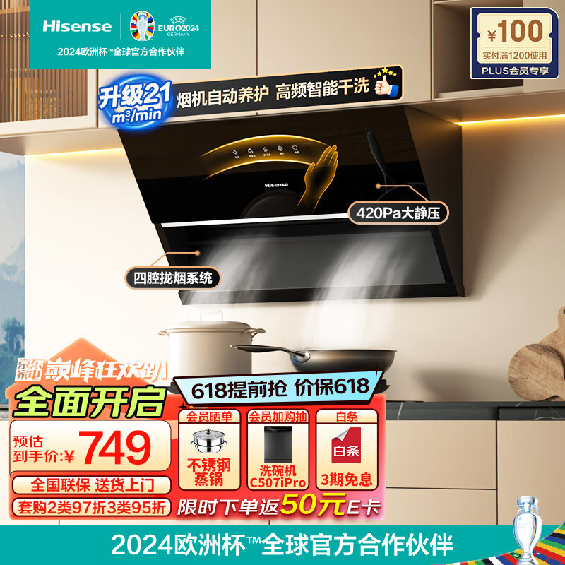 海信(Hisense)家用抽油烟机 侧吸式吸油烟机 21立方大吸力 四腔拢烟 自动清洗 脱排油烟机以旧换新DJ906H价格:799.00元!