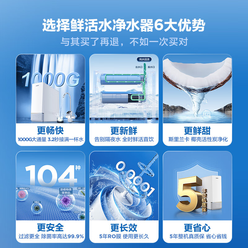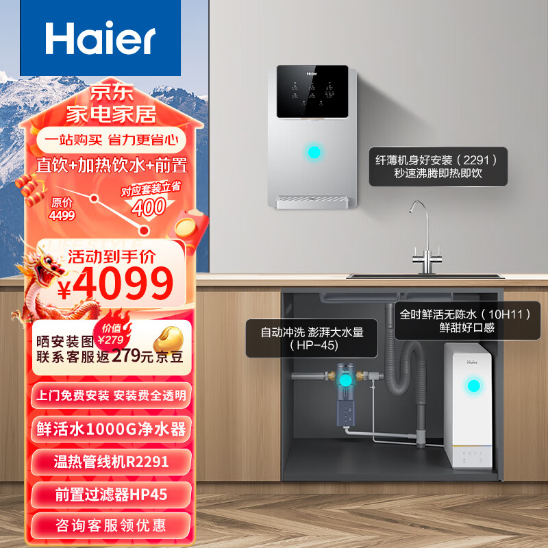 海尔(Haier)鲜活水净水器家用净水机厨下式RO反渗透直饮母婴净水器+前置过滤器+管线机HRO10H11+HP45+R2291价格:4099.00元!
