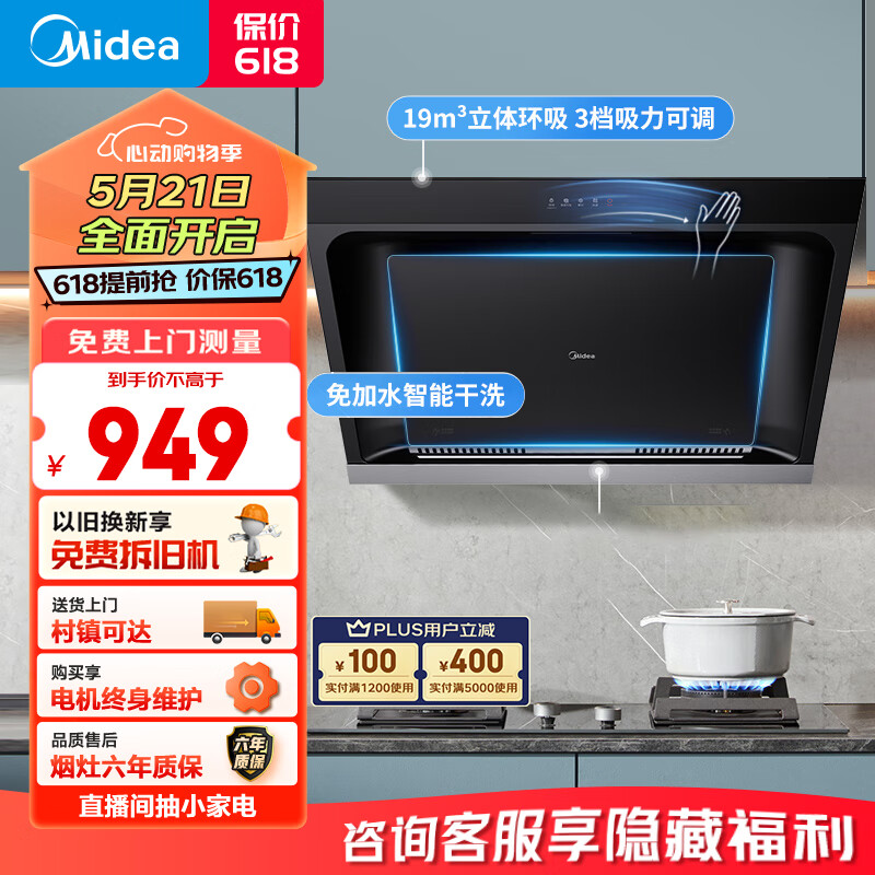 美的(Midea)抽油烟机 家用厨房侧吸式吸油烟机大吸力 自动清洗挥手智控 脱排油烟机JP32价格:949.00元!