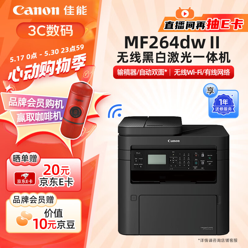 佳能(Canon)MF264dwⅡ A4幅面无线黑白激光多功能一体机(打印/复印/扫描/输稿器/自动双面打印 商用)价格:2839.00元!