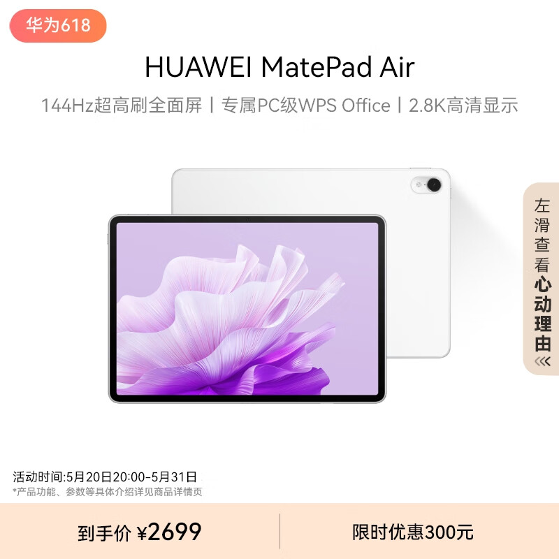 HUAWEI MatePad Air 华为平板电脑11.5英寸144Hz护眼屏2.8K超清办公学习娱乐 8+256GB 云锦白价格:2699.00元!