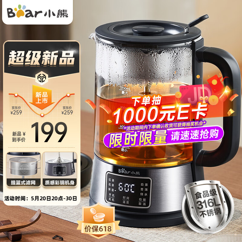 小熊(Bear)养生壶 1.2L大容量煮茶器煮茶壶 316L不锈钢喷淋蒸茶壶泡茶壶 煮茶烧水一体 ZCQ-D12Z5价格:199.00元!