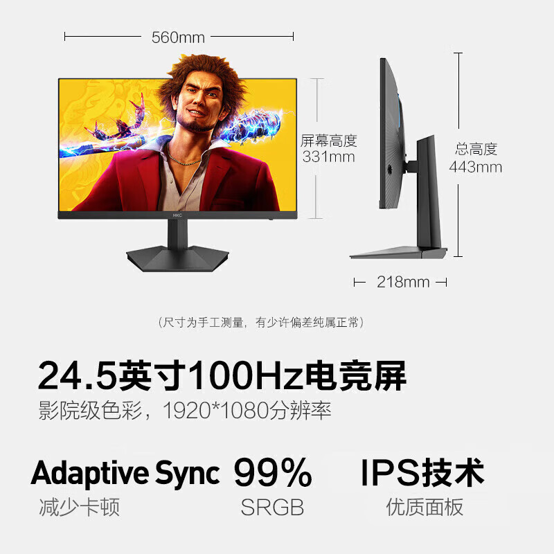 HKC 24.5英寸 IPS屏幕 100Hz HDR10高清广色域 低蓝光不闪屏 超薄办公电竞游戏显示器屏幕 VG255 SE价格:599.00元!
