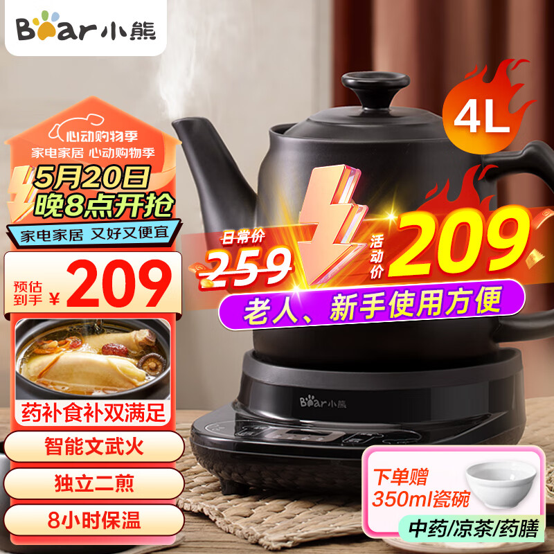 小熊(Bear) 煎药壶中药锅 全自动4L大容量分体式陶瓷电熬药养生壶中药煲药罐熬药电砂锅 JYH-C40D2 4L价格:259.00元!