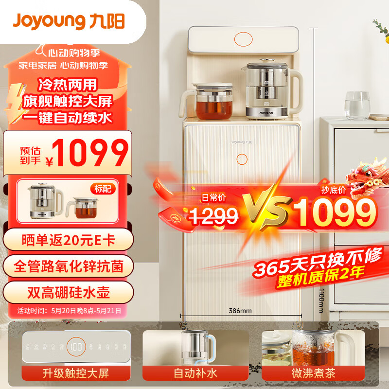 九阳(Joyoung)茶吧机 家用饮水机一键全自动下进水触控大屏多功能遥控立式下置水桶中大型柜体冷热型JYW-WH600C价格:1099.00元!