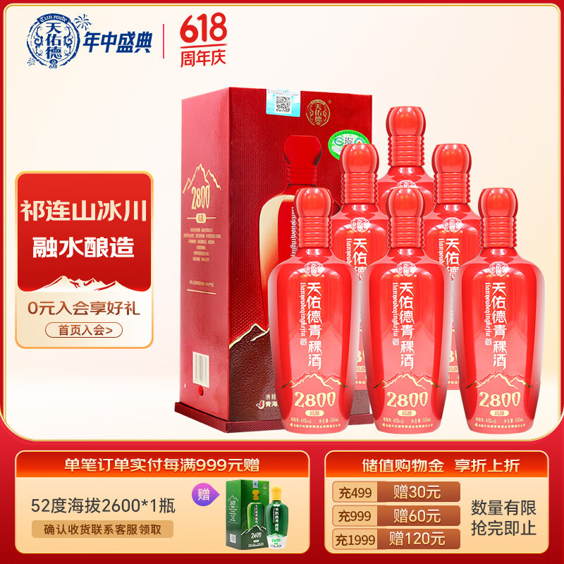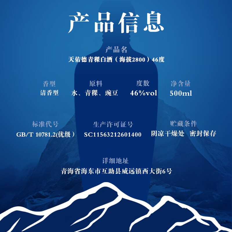 天佑德 海拔2800 清香型白酒 46度 500ml*6瓶 整箱装【青海青稞酒】价格:598.00元!