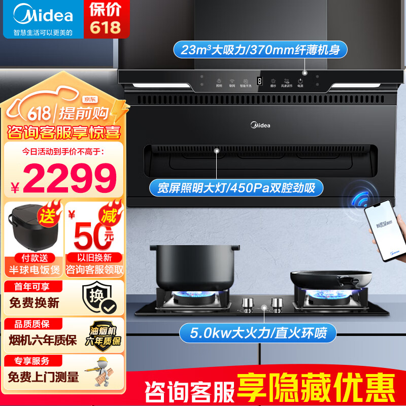 美的(Midea)家用抽油烟机顶侧双吸 23立方大吸力自清洁吸油烟机燃气灶具烟灶套装 天然气厨房电器 DC2+Q330价格:2499.00元!