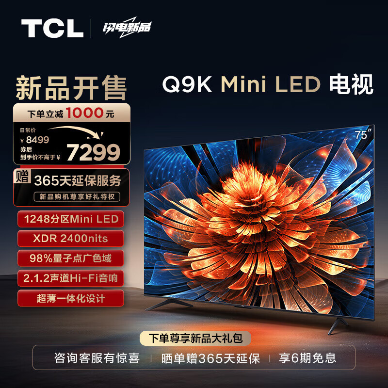 TCL电视 75Q9K 75英寸 Mini LED 1248分区 XDR 2400nits QLED量子点 超薄 4K 平板电视机 以旧换新 75英寸 官方标配价格:8499.00元!
