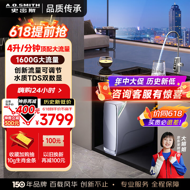 史密斯(A.O.SMITH)佳尼特净水器蓝鲸4000家用厨下式直饮净水机反渗透4升/分钟顶配大流量0陈水 1600G CR4000AB1价格:4499.00元!