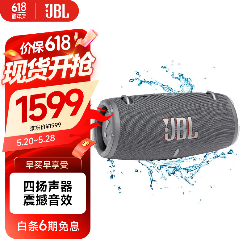 JBL XTREME3 音乐战鼓三代 便携蓝牙音箱 户外音箱 电脑音响 低音炮 四扬声器系统 防尘防水 灰色价格:1599.00元!