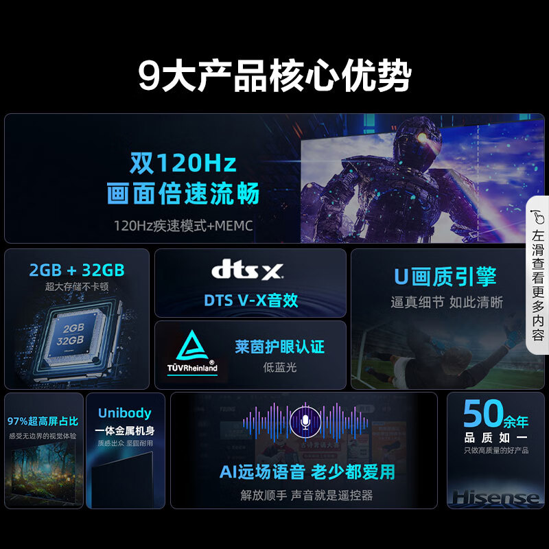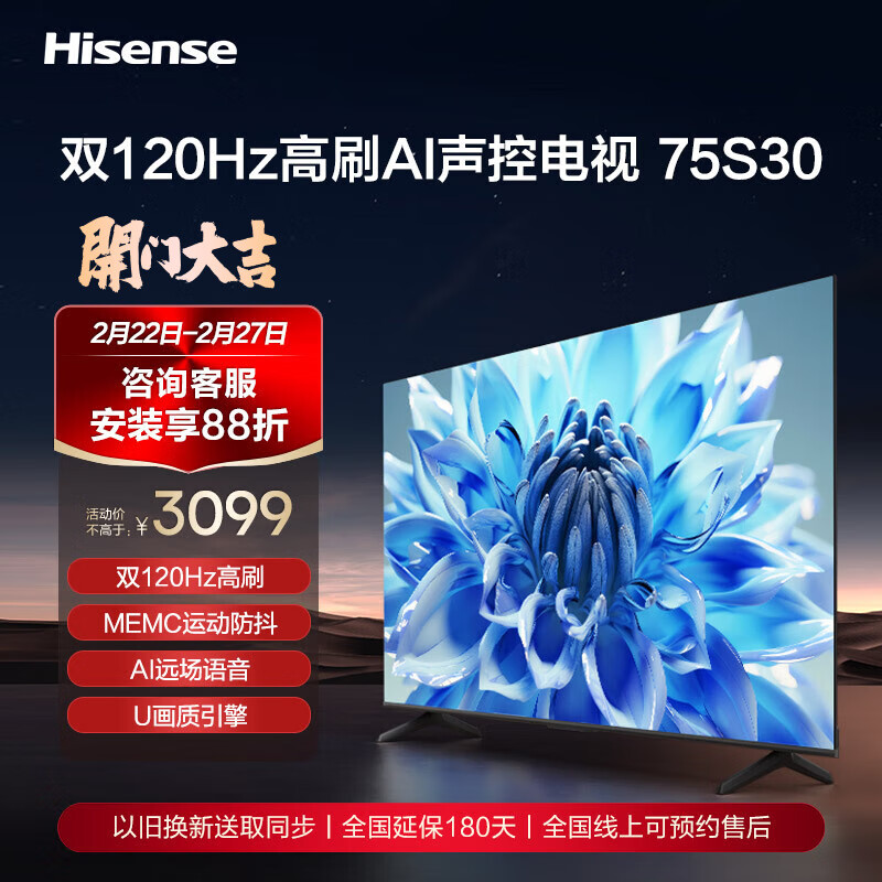 海信(Hisense)电视75S30 75英寸 120Hz高刷 2GB+32GB内存 高清全能投屏 AI远场语音电视机 75英寸价格:3499.00元!