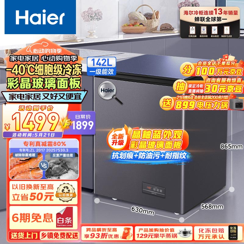 海尔(Haier)142升-40℃彩晶低霜小冰柜家用商用 冷藏柜冷冻柜冰柜小型小冰箱小型冷柜BC/BD-142GHEPGD以旧换新价格:1599.00元!