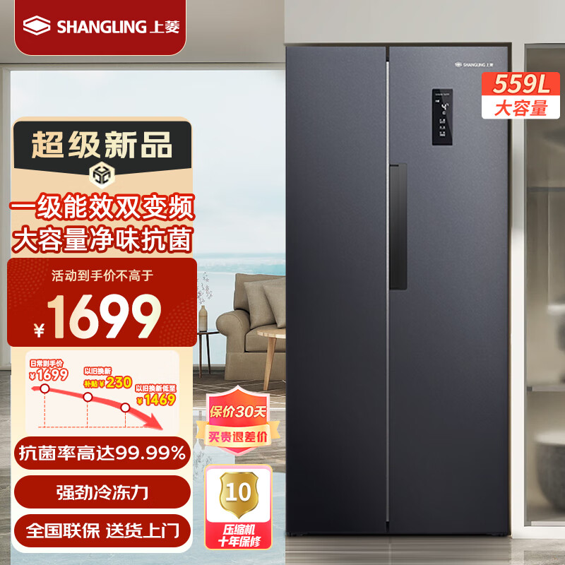 上菱559升双开门冰箱对开门风冷无霜十大冰箱排名一级能效变频超薄家用大容量节能电冰箱BSE559PWL价格:1699.00元!