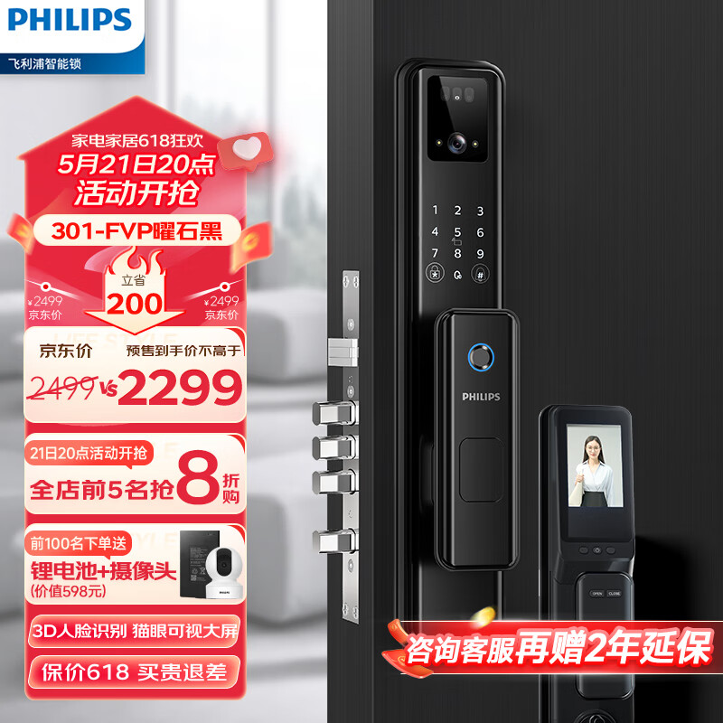 飞利浦(PHILIPS)智能锁301 智能门锁 指纹锁 可视猫眼大屏密码锁防盗门锁WIFI智联 301FVP-曜石黑(人脸+大屏猫眼)价格:2299.00元!