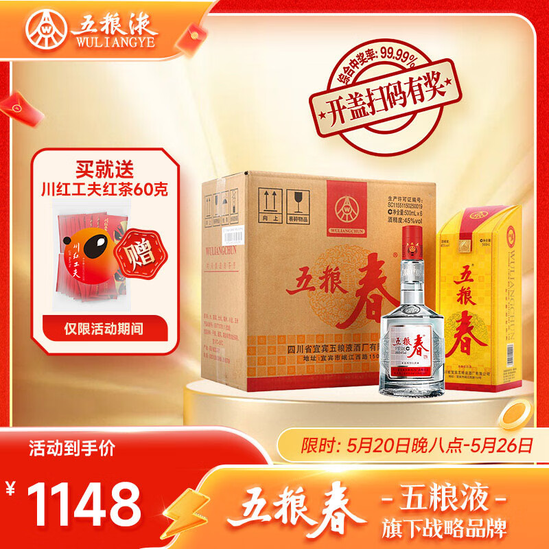 五粮液 五粮春 浓香型白酒 45度 500ml*6瓶 整箱装 端午节送礼价格:1148.00元!