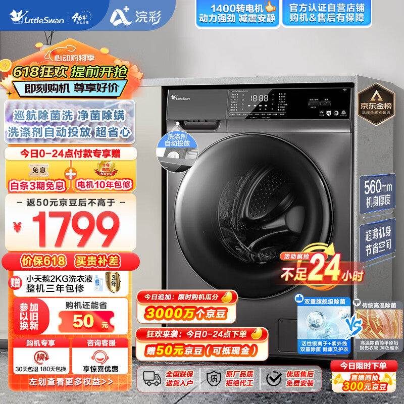 小天鹅(LittleSwan)滚筒洗衣机全自动 智能投放 浣彩系列 紫外线除菌 超薄机身 10公斤 TG100VT616WIADY-T1B价格:1826.00元!