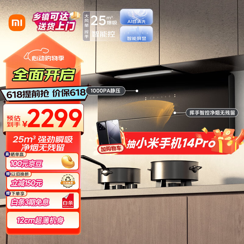米家小米智能超薄近吸油烟机S1 25大吸力小尺寸智能变频侧吸抽油烟机 挥手智控烟灶联动套装MJ07价格:2299.00元!