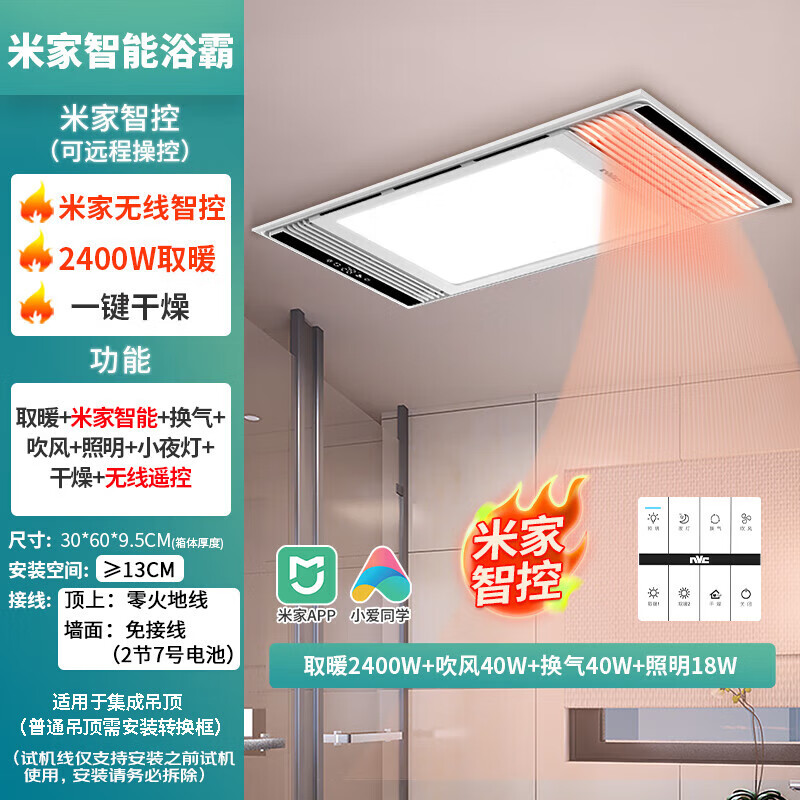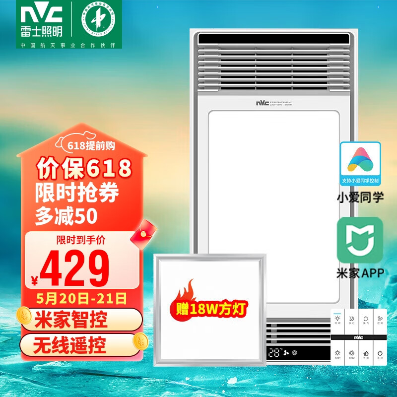 雷士(NVC)米家智能浴霸暖风照明排气一体机浴室电暖器卫生间集成吊顶Y336价格:879.00元!