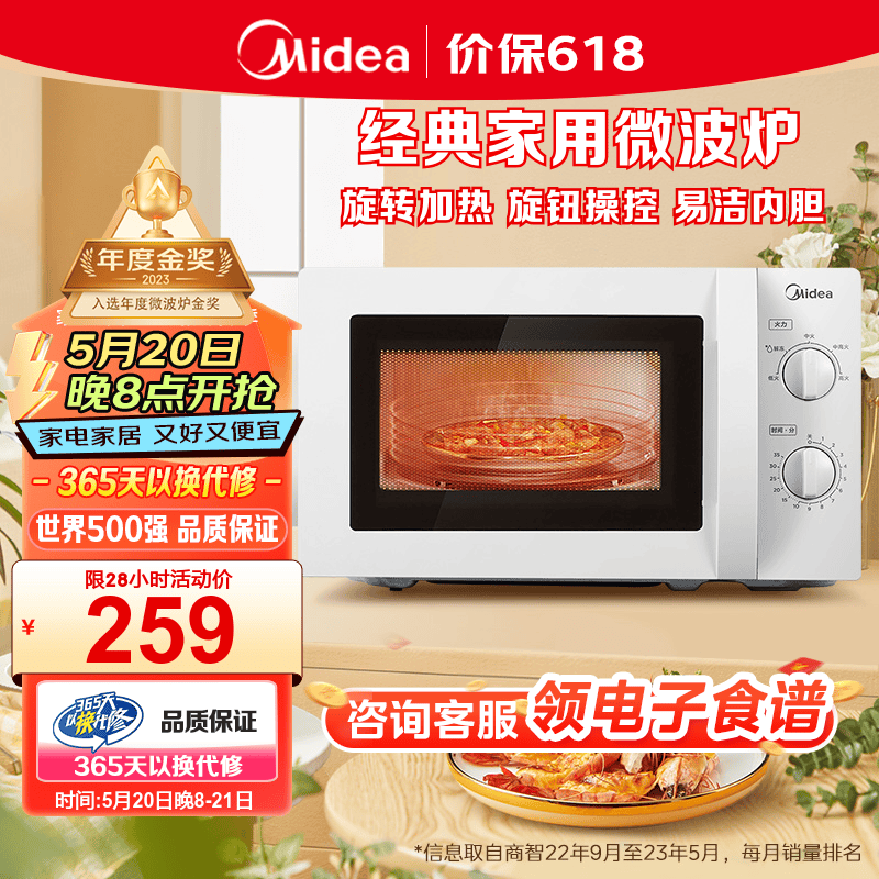 美的(Midea)快捷微波炉 家用小型 360°转盘加热 旋钮操控 易洁内胆(M1-L213B)价格:259.00元!