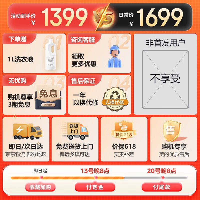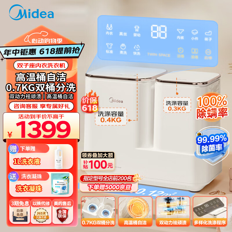 美的(Midea)双子座内衣洗衣机小型全自动分区双桶洗漂脱 双动力电机护衣 高温银离子除菌除螨洗袜子MNB7VA0E价格:1399.00元!
