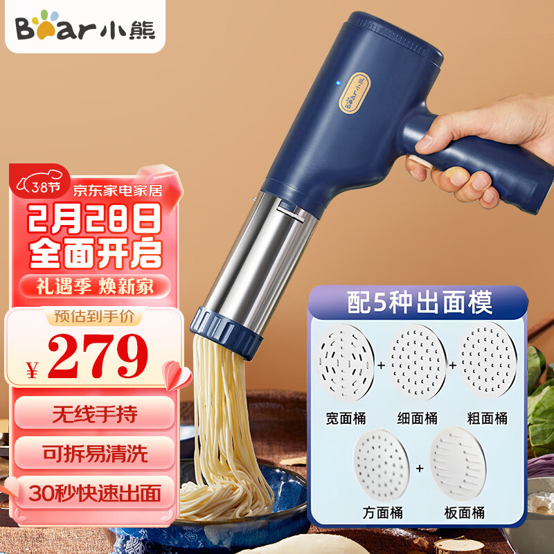 小熊(Bear) 无线面条机家用压面机手持压面枪小型电动自动不锈钢压面条机 升级面条机(5种模具)价格:279.00元!