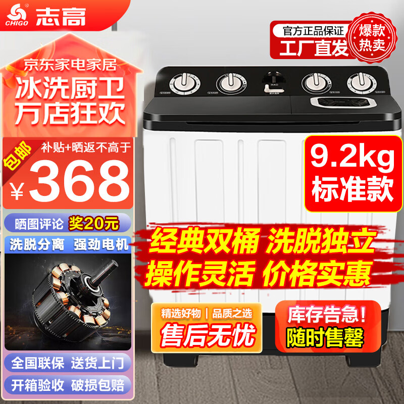 志高(CHIGO)半自动双缸洗衣机9.2公斤租房宿舍家用大容量双桶双缸波轮洗衣机脱水甩干双筒 塑料盖板价格:428.00元!