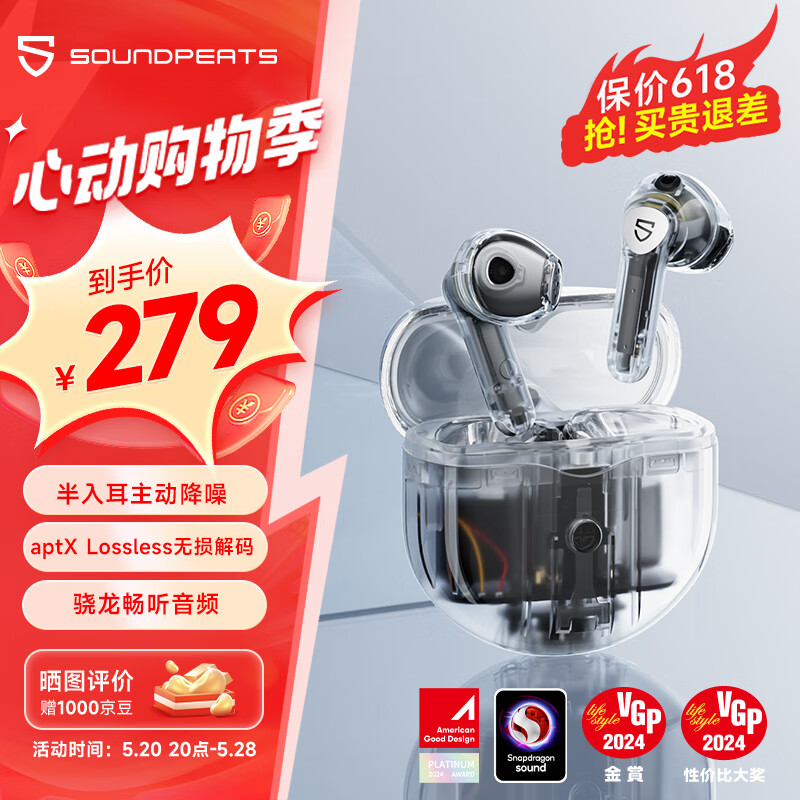 泥炭(SoundPEATS)Air4 未来感 主动降噪真无线蓝牙耳机 半入耳式 泥炭蓝牙耳机主动降噪 蓝牙5.3耳机 透镜白价格:279.00元!