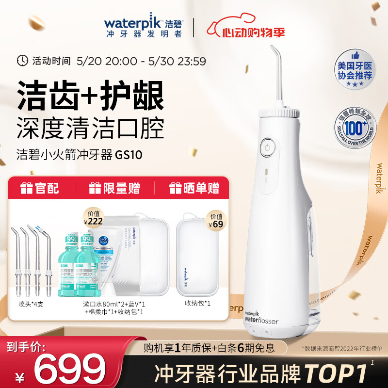 洁碧(Waterpik)冲牙器便携式电动洗牙器水牙线家用立式预防牙结石正畸适用全身水洗【小火箭】520礼物价格:699.00元!