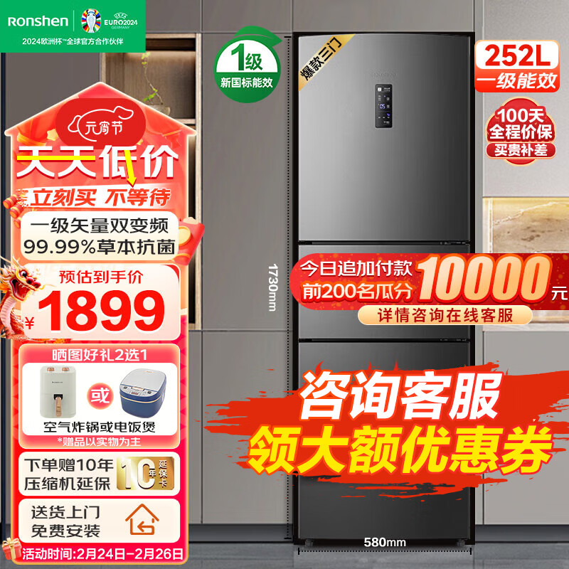 容声(Ronshen)252升家用三开门多门变频一级能效节能风冷无霜电冰箱 小户型宿舍租房用小型冰箱 BCD-252WD18NP价格:1899.00元!