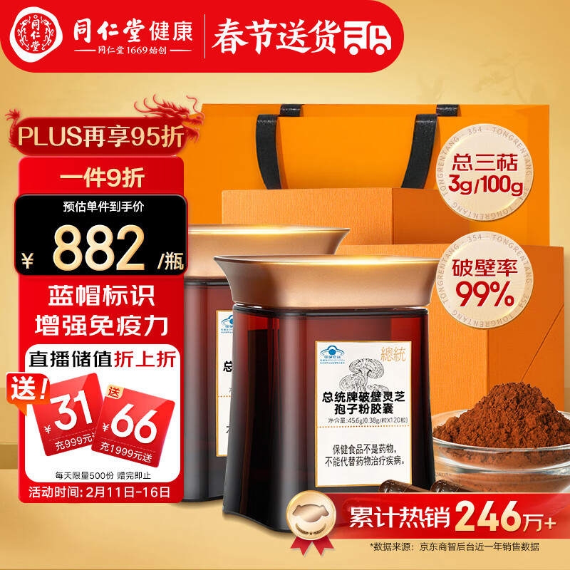 同仁堂总统牌破壁灵芝孢子粉胶囊升级版(0.38g/粒×120粒)*2盒增强免疫力 总三萜3g/100克 破壁率99%价格:1960.00元!