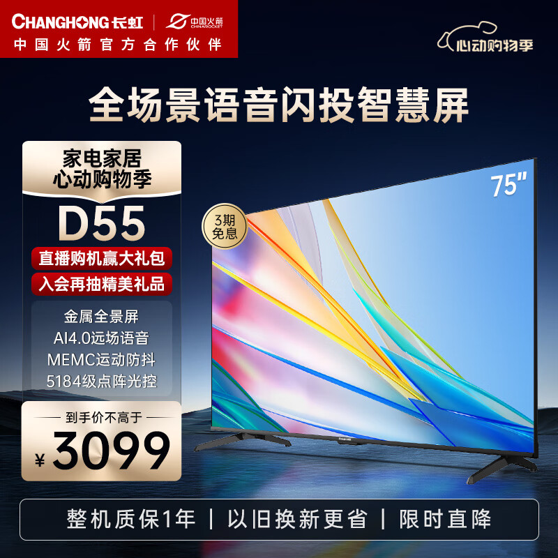 长虹电视75D55 75英寸4K超高清全景屏 MEMC防抖 远场语音 杜比视界 2+16GB平板液晶LED电视机 以旧换新价格:3099.00元!