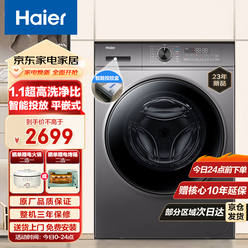 海尔(Haier)10KG滚筒洗衣机全自动变频一级能效超薄平嵌智能投放除菌+1.1高洗净比+羊毛羽绒洗XQG100-BD1216价格:2699.00元!