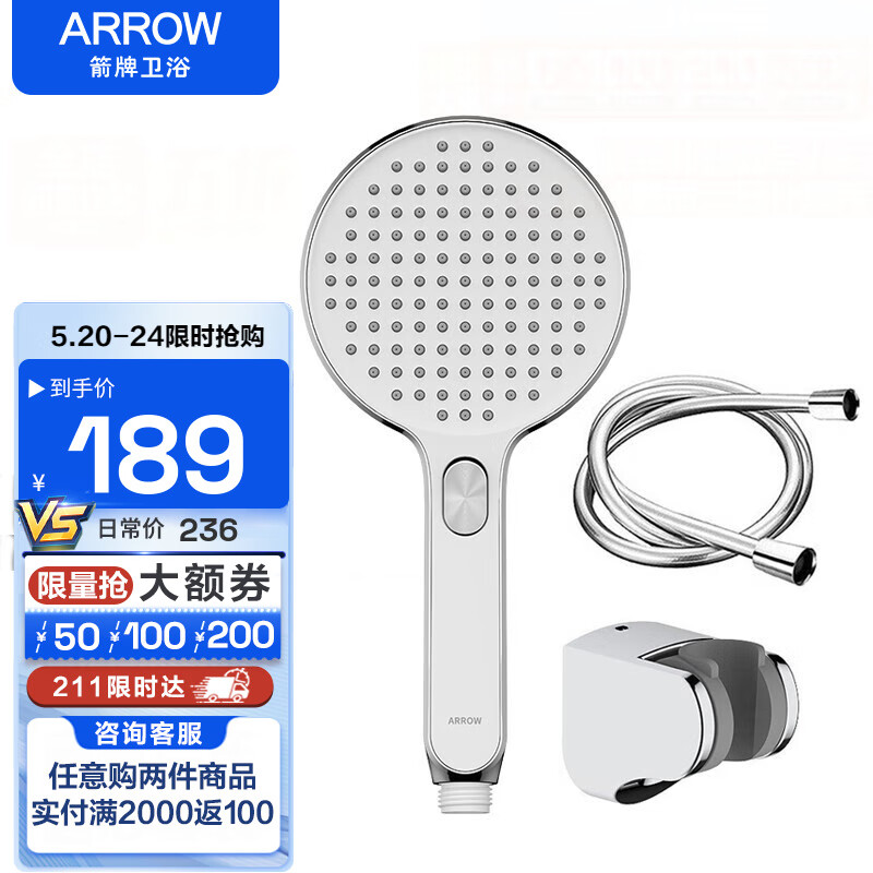 箭牌(ARROW)手持花洒套装增压宽屏超大加厚面板淋浴手持莲蓬头花洒喷头 增压加厚手持套装(圆形)价格:236.25元!