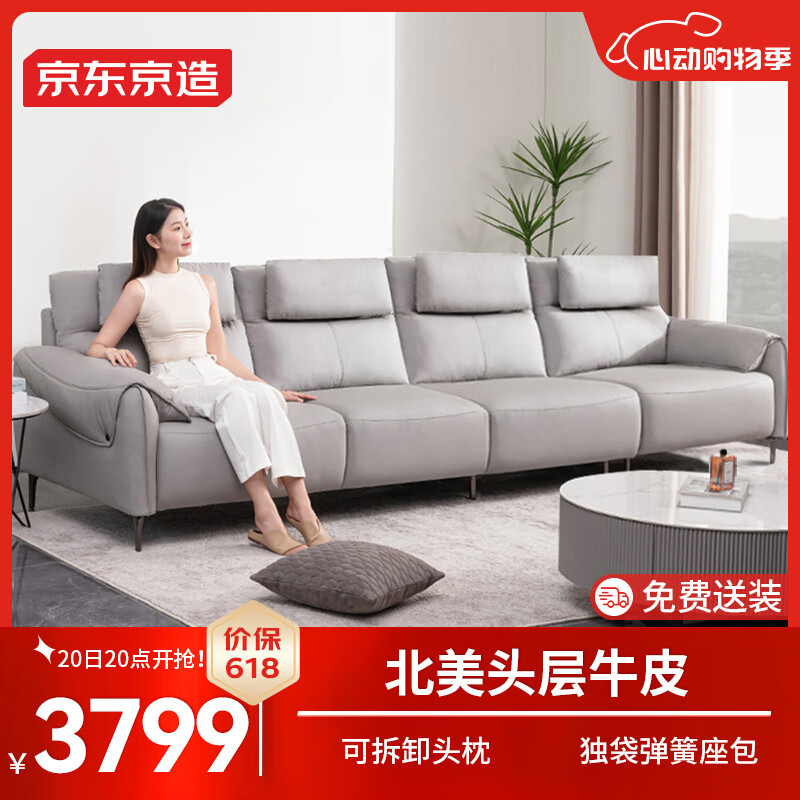 京东京造真皮沙发 北美头层牛皮可拆卸头枕弹簧座包 客厅大户型3.4m灰ST08价格:4299.00元!