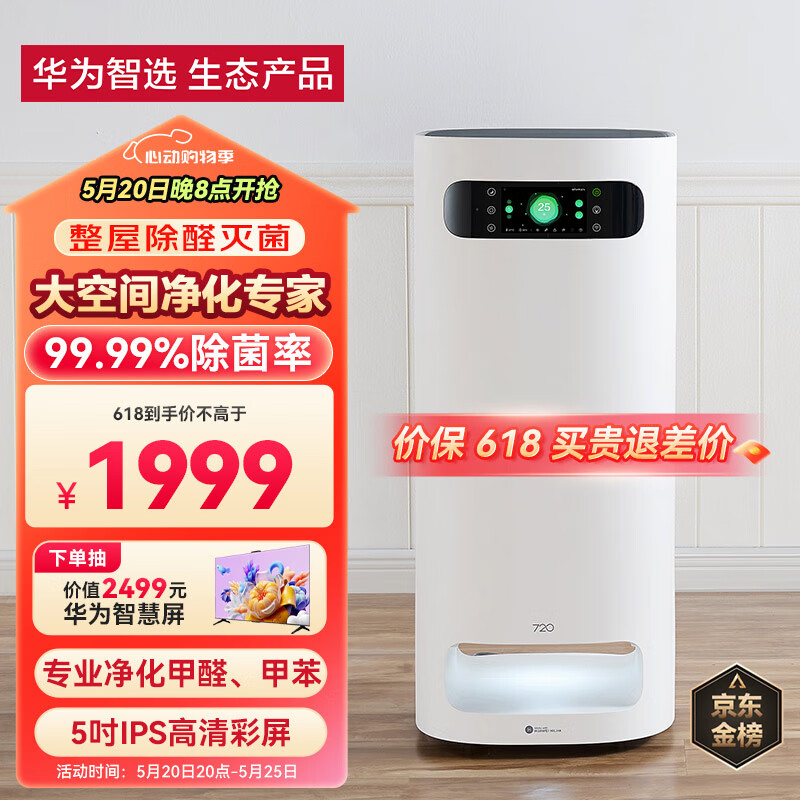 华为智选720空气净化器1PRO 专业级除甲醛双重除菌除异味除过敏原 99.99%消毒性能 家用大空间价格:2299.00元!