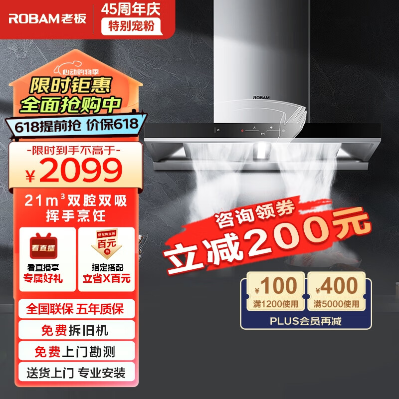 老板(Robam)抽油烟机欧式顶吸式双腔油烟机家用21风量吸油烟机挥手智控免拆洗易洁排油烟机以旧换新60A1抽烟机价格:2299.00元!