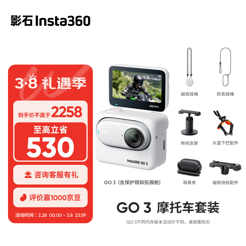 Insta360影石 GO 3拇指相机 运动亲子Vlog骑行宠物防水防抖运动相机(摩托车套装 灵动白64G版)价格:2258.00元!