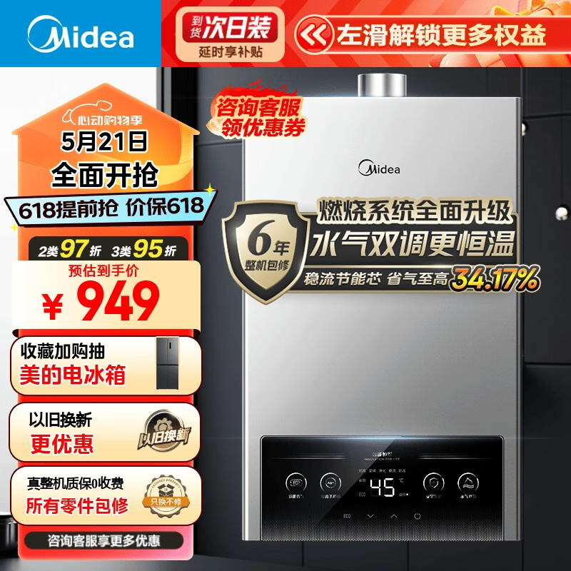 美的(Midea)16升燃气热水器 水气双调 天然气 ECO节能 四季恒温洗 无极变升 LED大屏JSQ30-MK1耀影价格:949.00元!