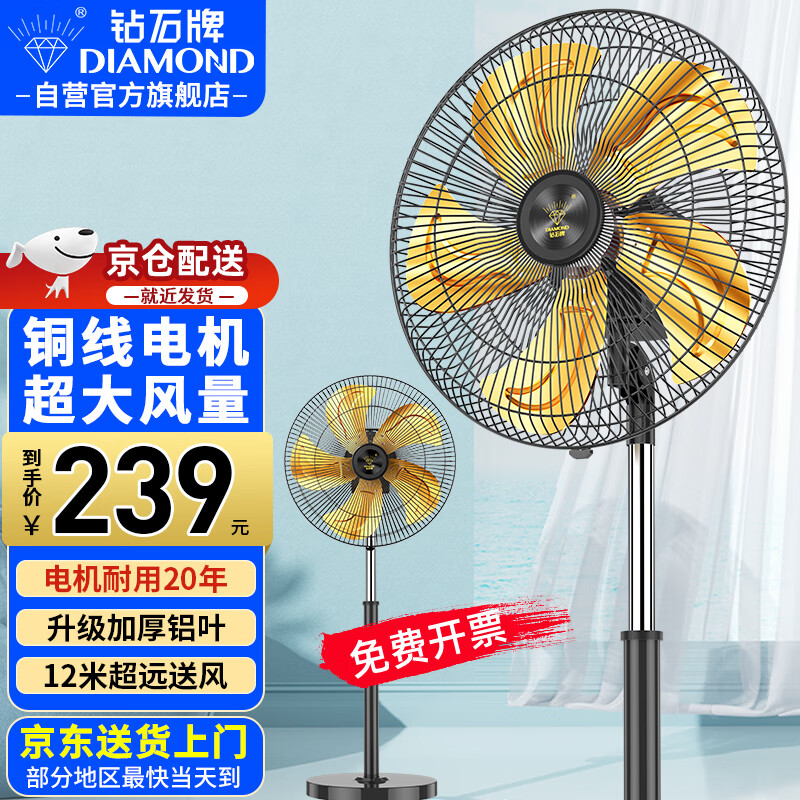 钻石牌(DIAMOND) 工业风扇落地扇家用立式电风扇大风力摇头强力电扇客厅商用工厂车间铝叶商业风扇 HF-1802金色五叶 推荐商铺/车间价格:259.00元!