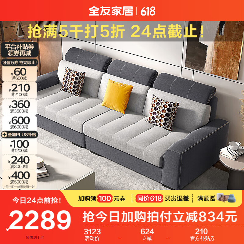 全友家居 现代简约小户型客厅布艺沙发家具家用直排式一字沙发102251价格:3123.75元!