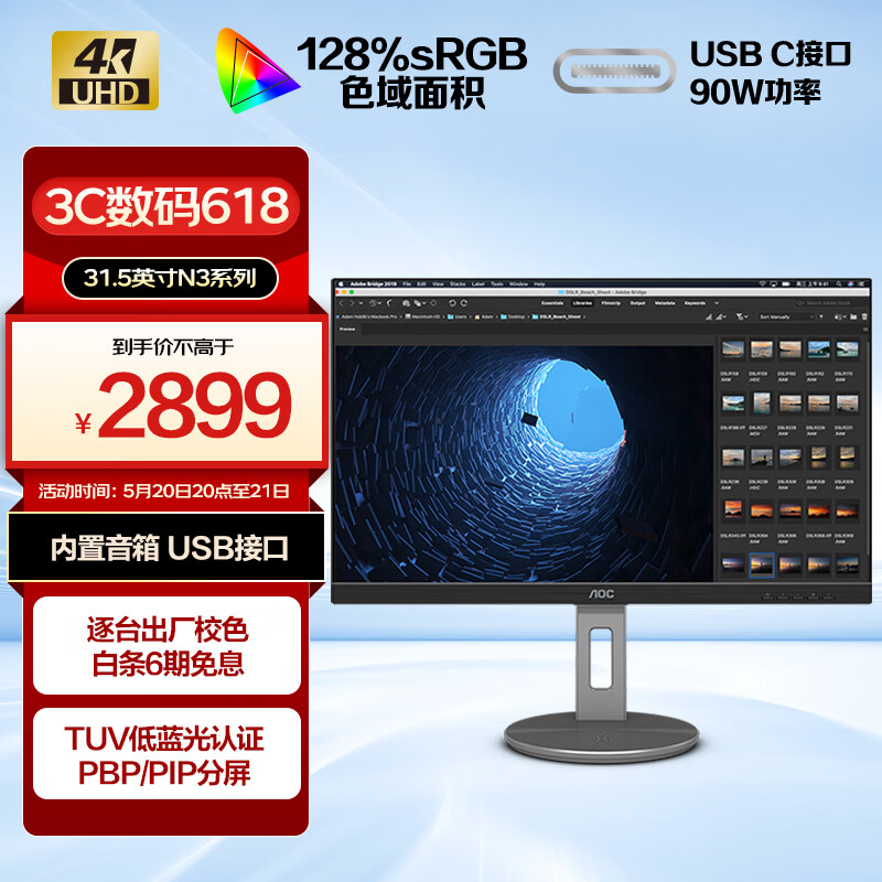 AOC 31.5英寸 4K高清 IPS HDR Type-C接口90W TUV爱眼认证 双向旋转升降 出厂校准 电脑显示器 U32N3C价格:2999.00元!