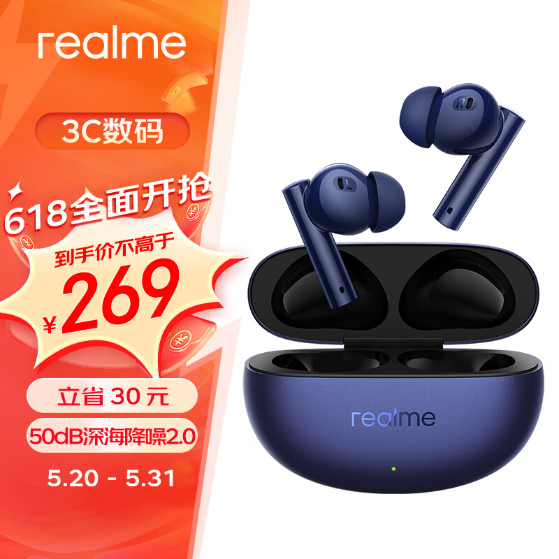 真我(realme)Buds Air5 真无线蓝牙耳机 50dB深海降噪 38小时长续航 通用苹果安卓小米手机 鲸蓝价格:269.00元!