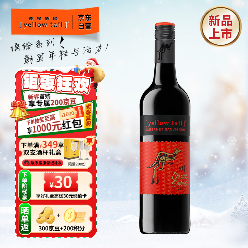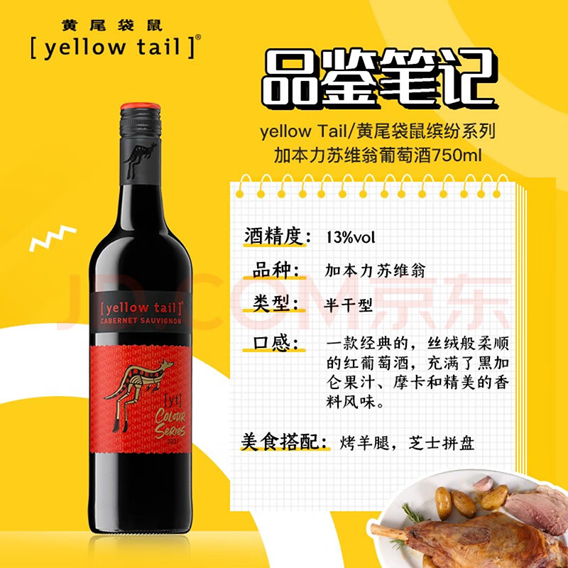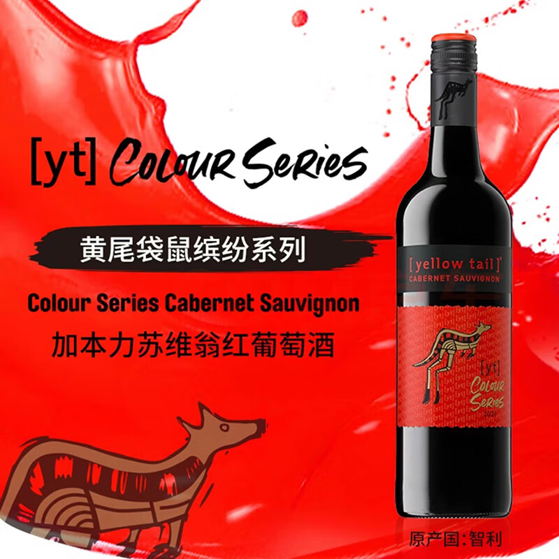 黄尾袋鼠(Yellow Tail)缤纷系列红酒 加本力苏维翁红葡萄酒智利版 原瓶进口 750ml价格:55.00元!