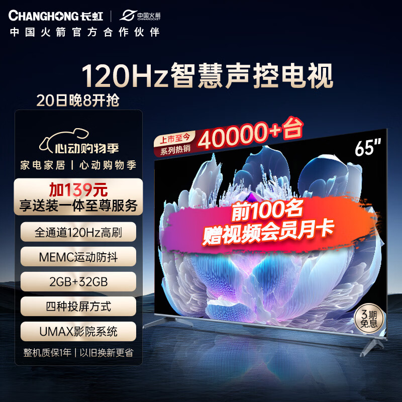 长虹电视65D6 65英寸120Hz高刷免遥控语音杜比视界 2+32GB MEMC四大投屏 4K平板液晶LED电视机以旧换新价格:2299.00元!