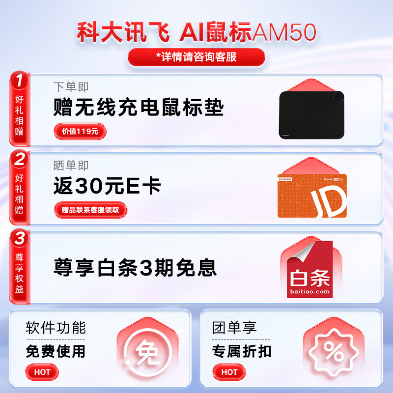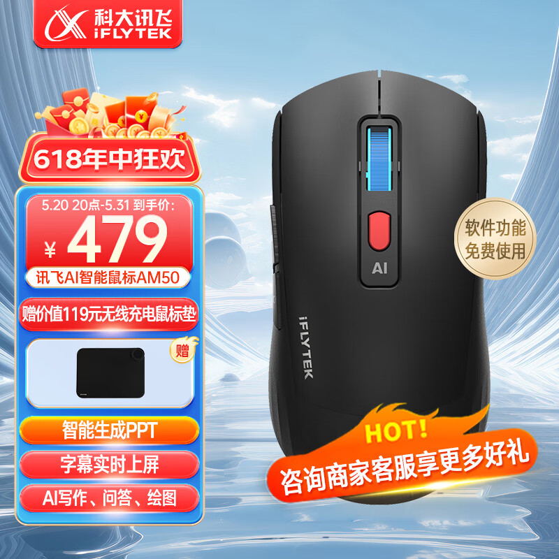 科大讯飞 AI智能鼠标AM50 无线鼠标 蓝牙鼠标 AI写作问答 智能生成PPT 无线充电 办公鼠标 黑色价格:479.00元!