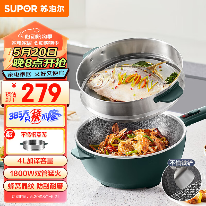 苏泊尔(SUPOR)电炒锅 电煮锅电子火红点精准控温家用多功能电热锅1800W大火力蒸煮一体多用途锅 CJ30A802价格:279.00元!