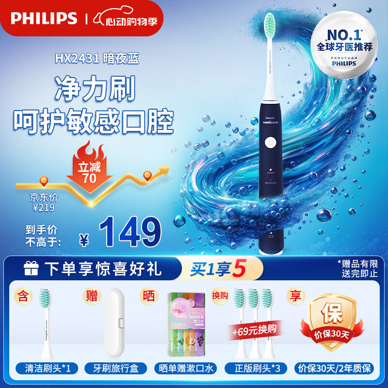 飞利浦电动牙刷S1成人情侣款生日礼物送男友/女友 入门款 2种模式洁齿护龈 净力刷 520情人节礼物 暗夜蓝HX2431/06价格:219.00元!