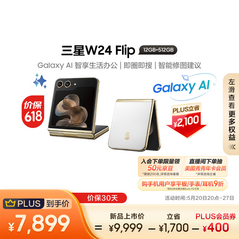 三星(SAMSUNG)W24 Flip AI手机 【价保618】智能外屏掌心折叠 拍照手机 同声翻译 12GB+512GB 冰瓷白 折叠屏手机价格:8299.00元!